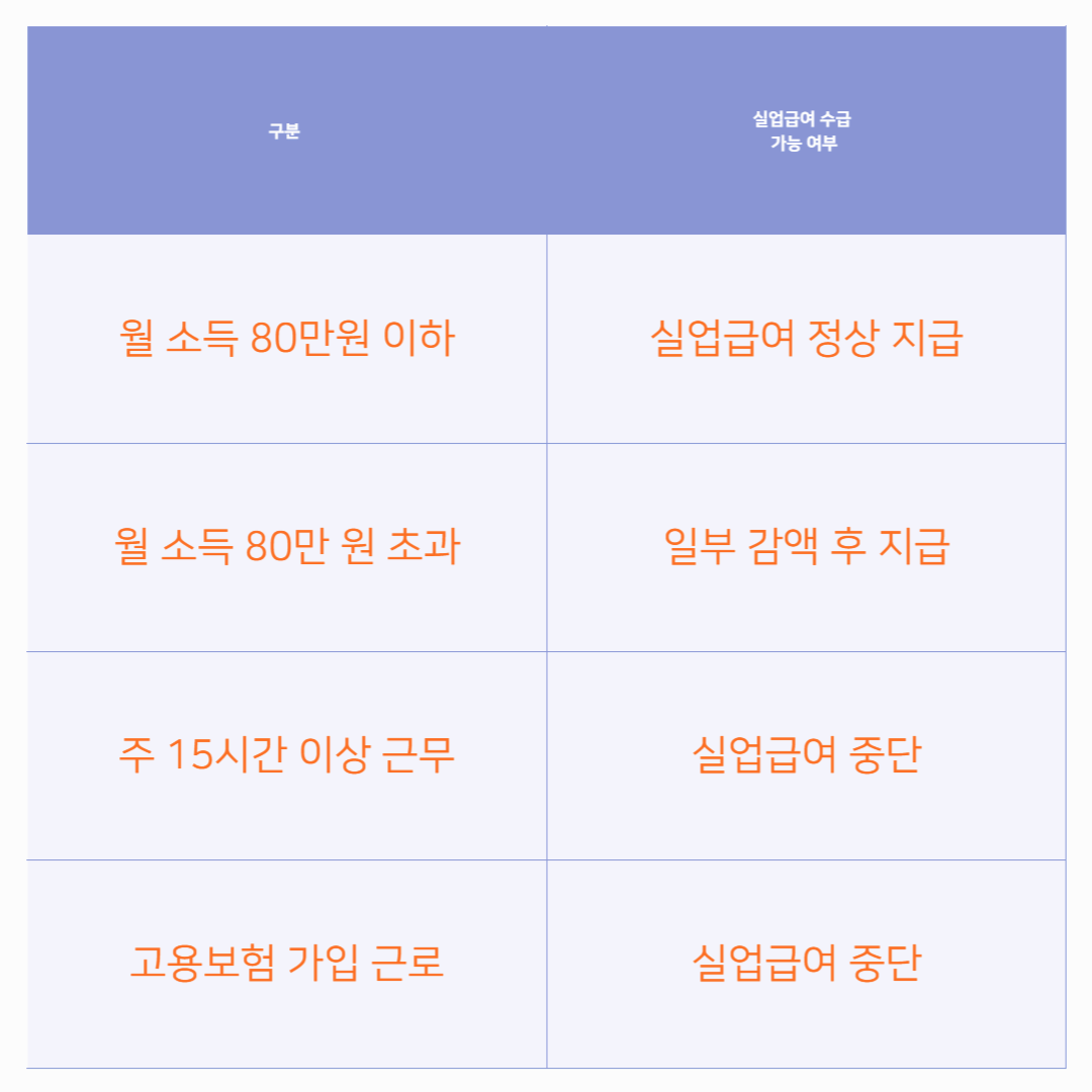 고용보험법에서는 월 80만 원 이하의 소득이나 주 15시간 이하의 근무는 실업급여를 유지하면서도 가능하도록 규정하고 있습니다.